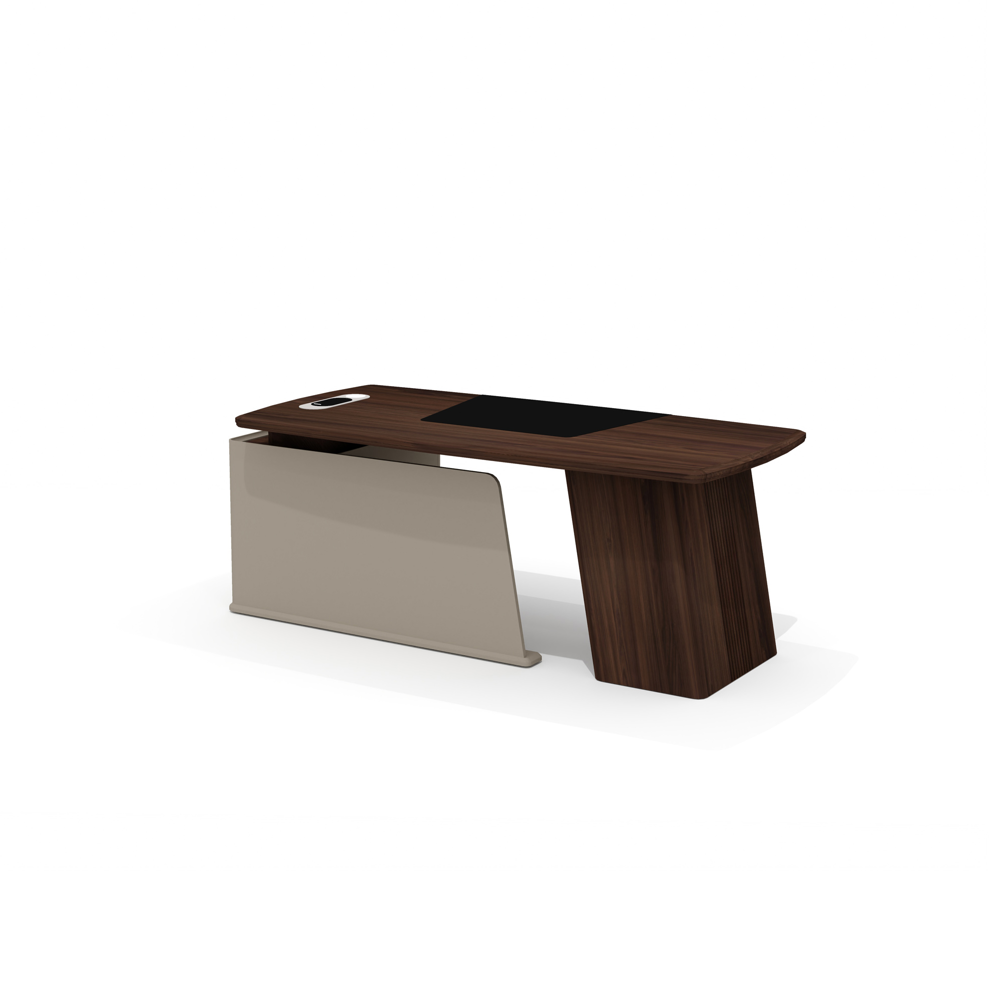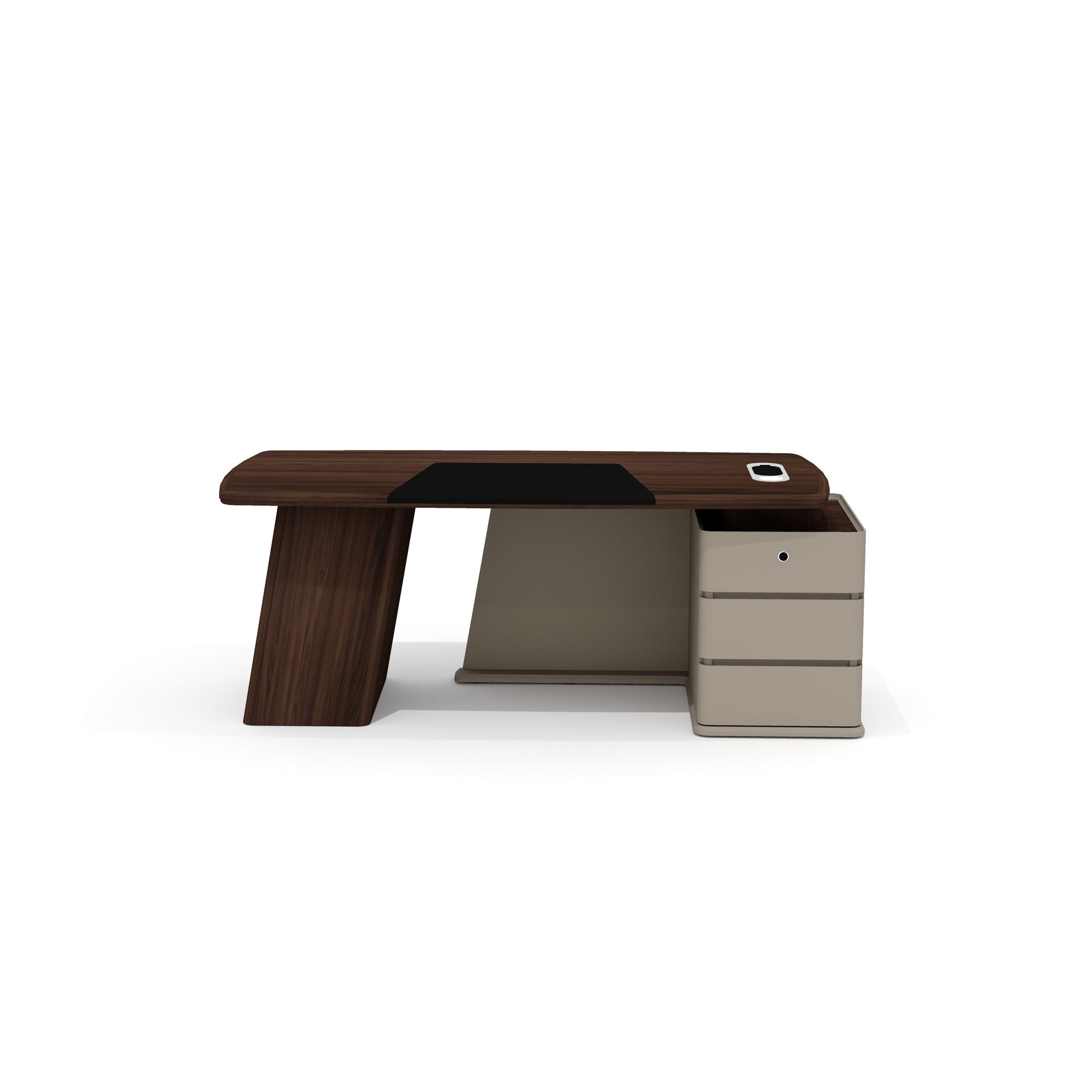 Тумба стола оборудована тремя выдвижными ящиками на шариковых направляющих с механизмом плавного закрывания. Верхний ящик защищен биометрическим замком, что обеспечивает надежную сохранность важных документов. Все фасады имеют удобные выступы для открывания, а скругленные углы делают использование стола удобным и безопасным.