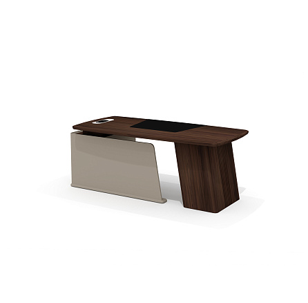 Основу стола составляет вместительная столешница толщиной 41 мм с интегрированным бюваром из экокожи размером 800х600 мм. Благодаря продуманной конструкции со скругленными углами и плавными линиями рабочее пространство становится максимально комфортным для размещения всей необходимой техники и документов. Наклонная опора, установленная под углом 10°, придает конструкции дополнительную устойчивость.