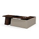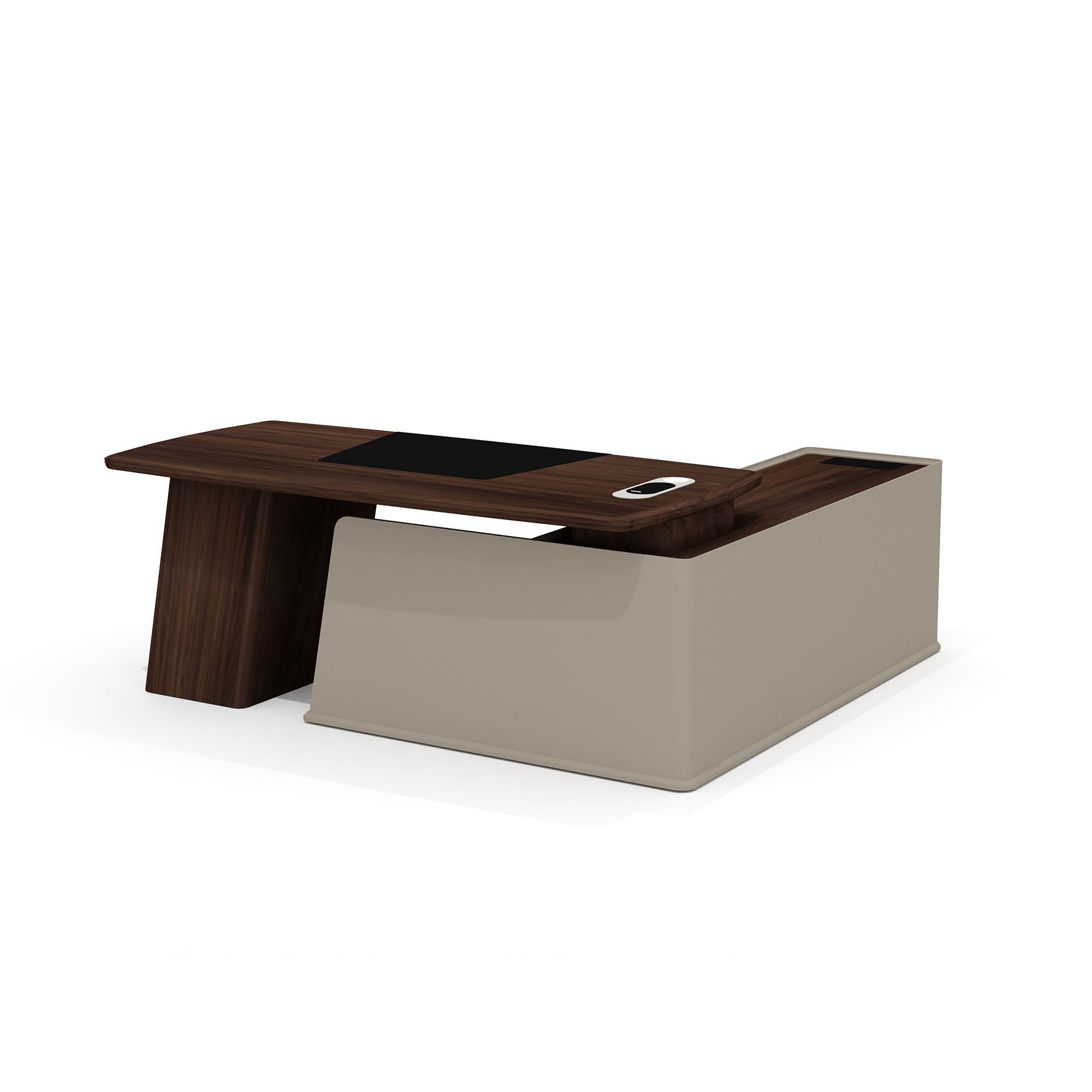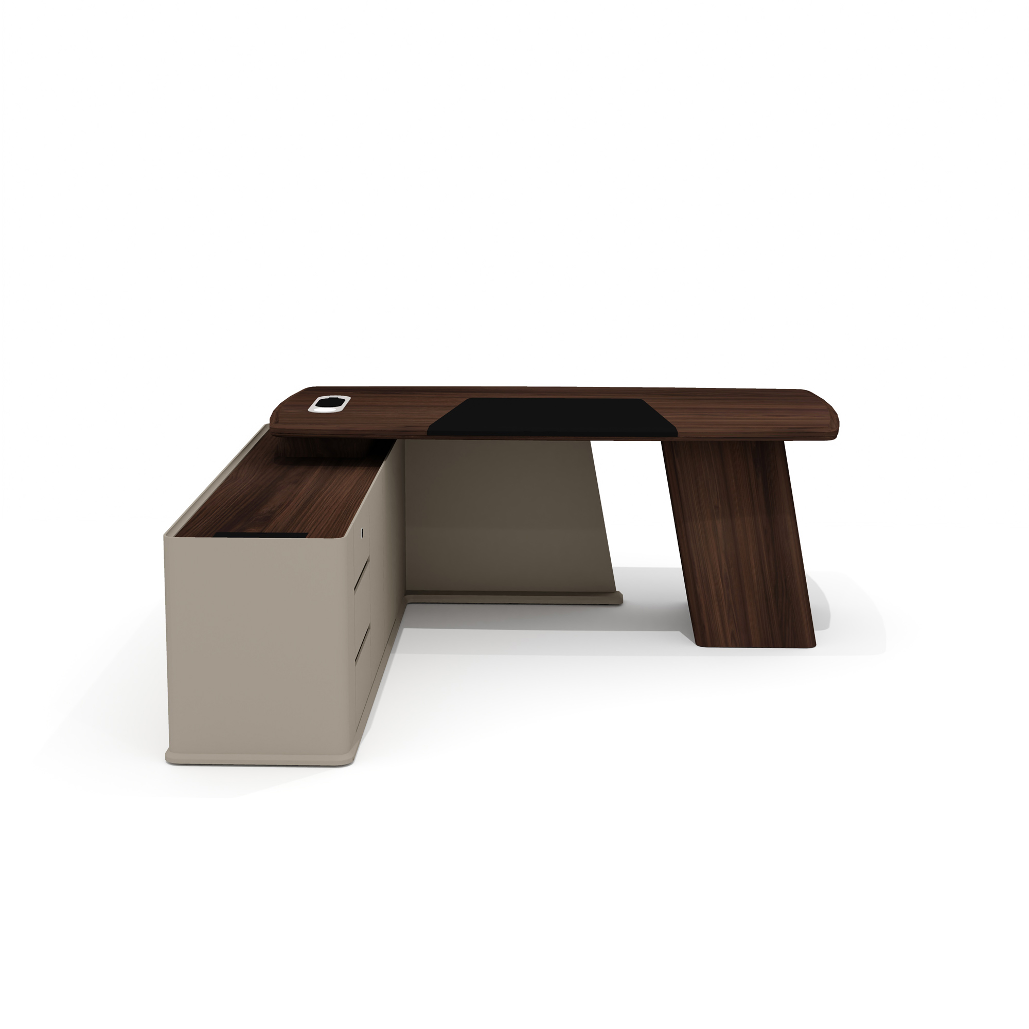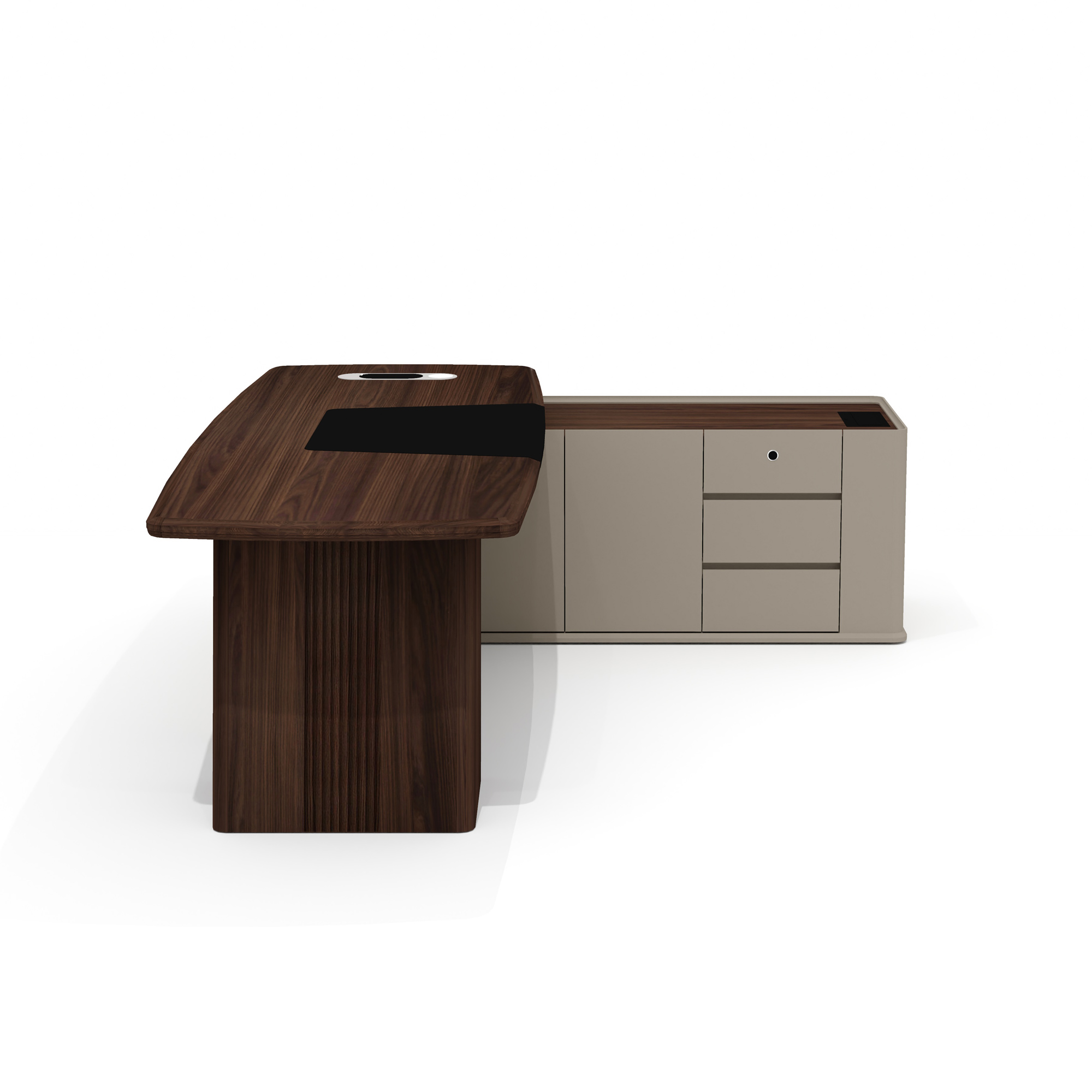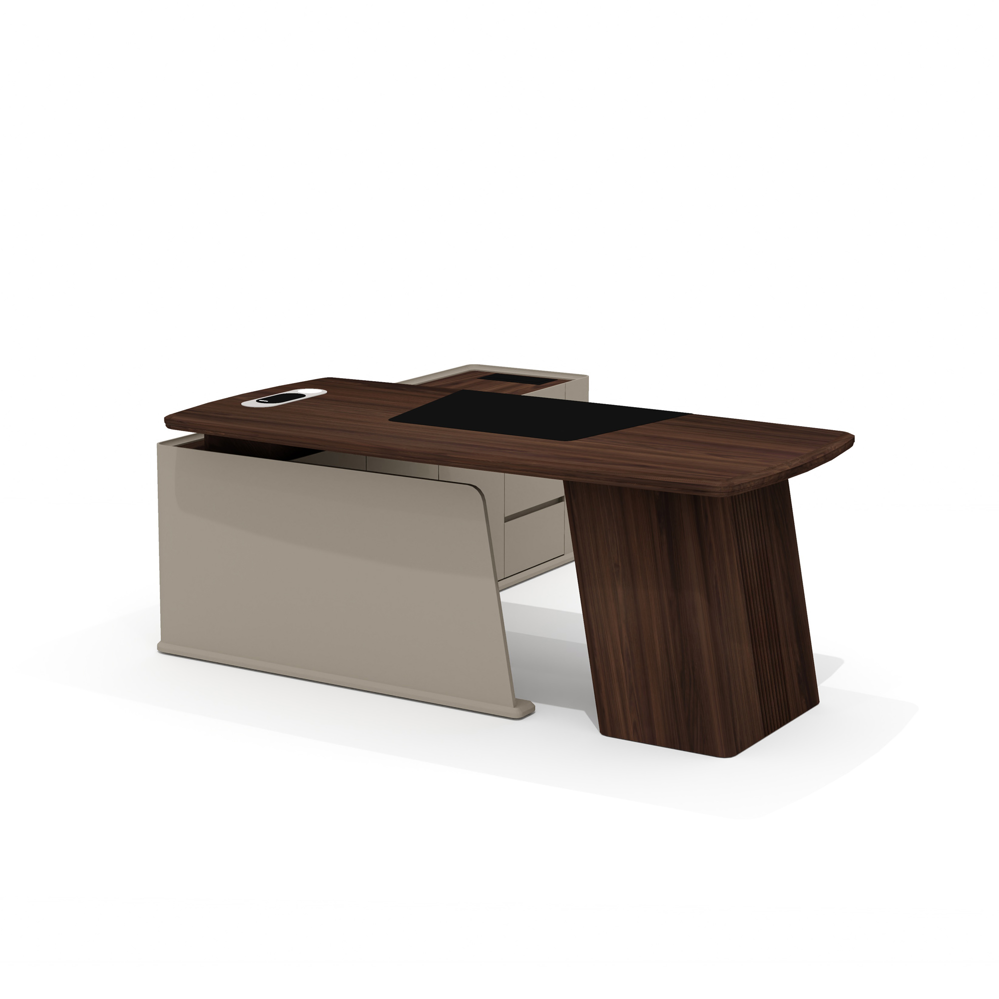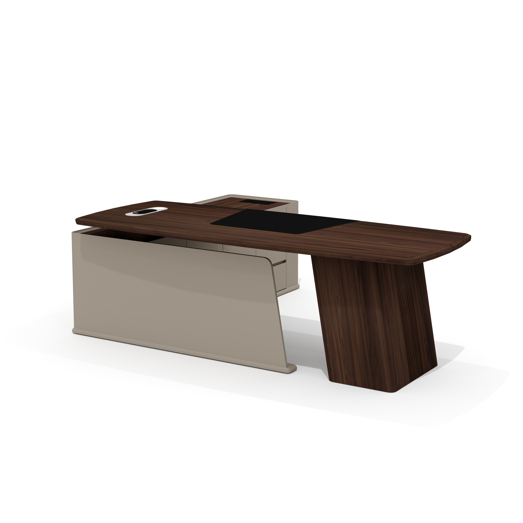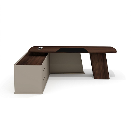 Опорная тумба стола разделена на три функциональных отделения: слева находятся три выдвижных ящика на шариковых направляющих с механизмом плавного закрывания, в центре — ниша с распашной дверцей, справа — просторное отделение для размещения компьютера и сопутствующего оборудования. Верхний ящик защищен биометрическим замком, обеспечивающим надежную сохранность важных документов. Все фасады оснащены удобными выступами для открывания, а утопленный топ тумбы защищает расположенные на нем предметы от падения.