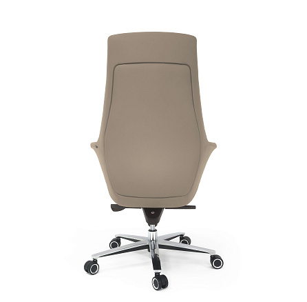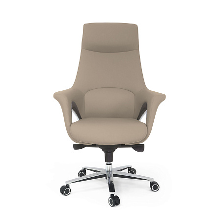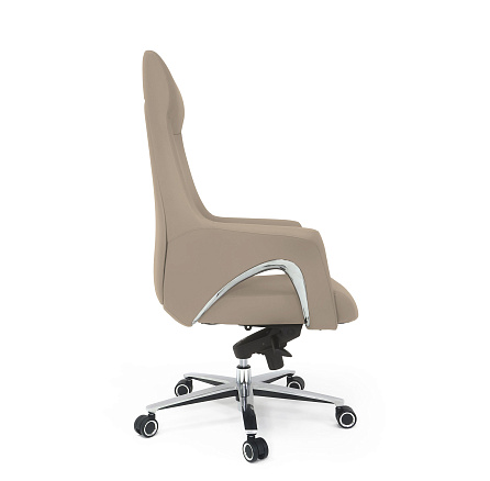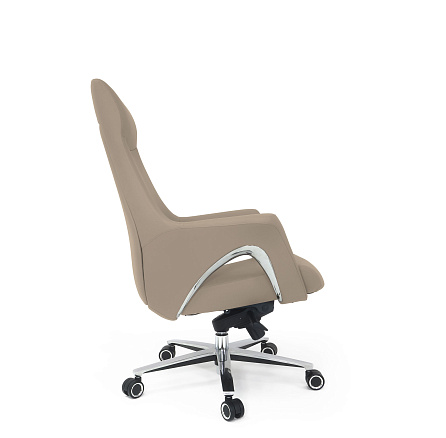 Обивка: лицевая часть — кожа, задняя часть — экокожа. Подлокотники объединены со спинкой, на подлокотниках вставки из хромированного металла. Крестовина: верх — полированный алюминий, низ — черное покрытие. Ролики увеличенного диаметра (64 мм)