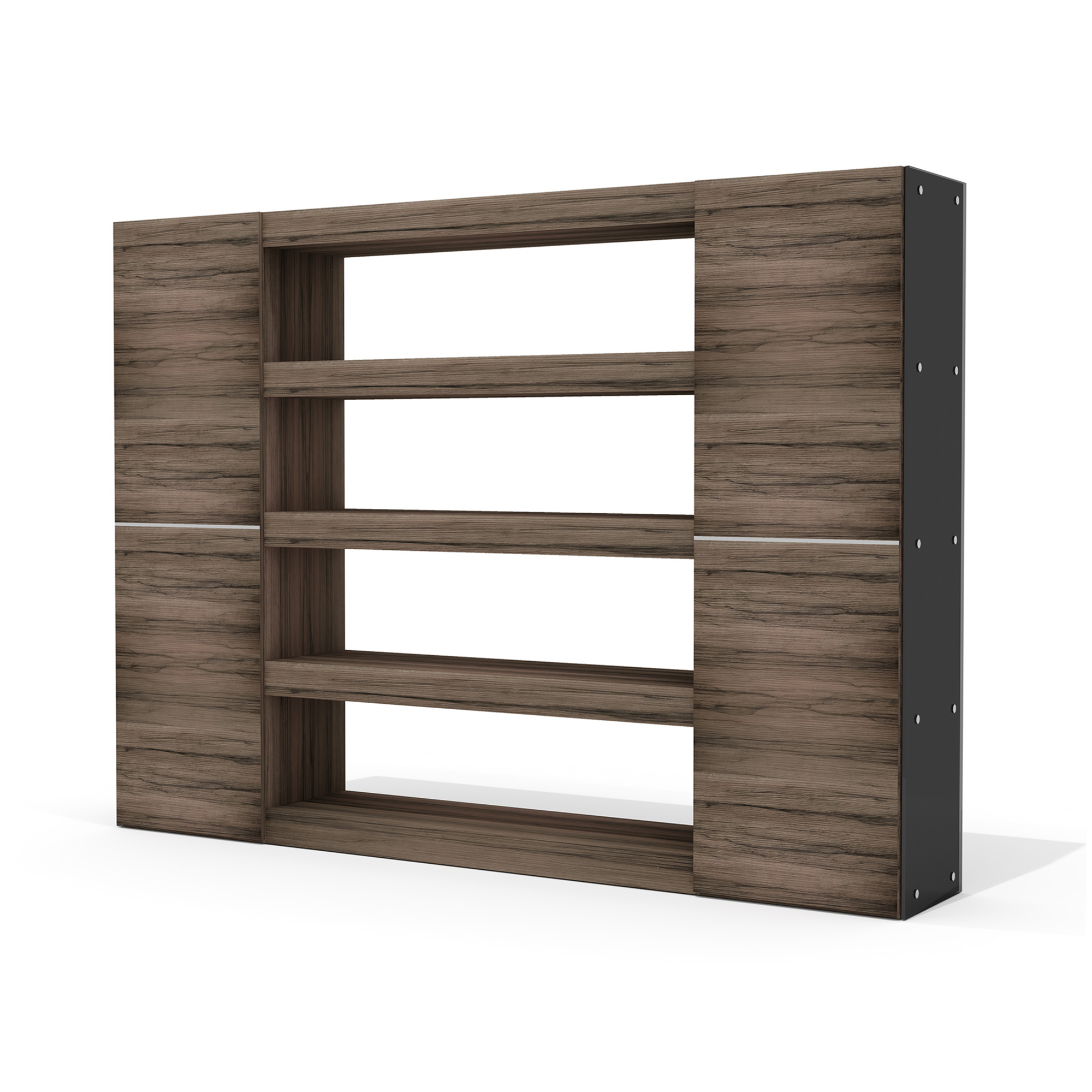 - Нижние панели столов, внутренние полки стеллажей, боковые и задние стенки выдвижных ящиков выполнены из ЛДСП толщиной 16 мм в цвете «антрацит». Торцы деталей обработаны кромочной